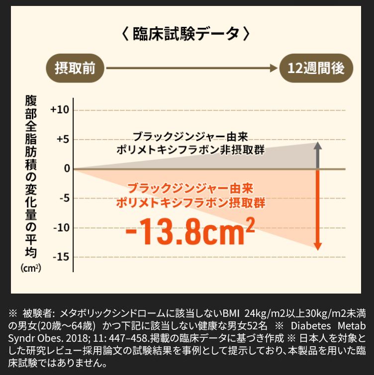 ブラックジンジャー由来ポリメトキシフラボンは、日常活動時のエネルギー代謝において、脂肪を消費しやすくする機能があることが報告されています。またBMIが高め(BMI24以上30未満)の方の腹部の脂肪を減らす機能があることが報告されています。