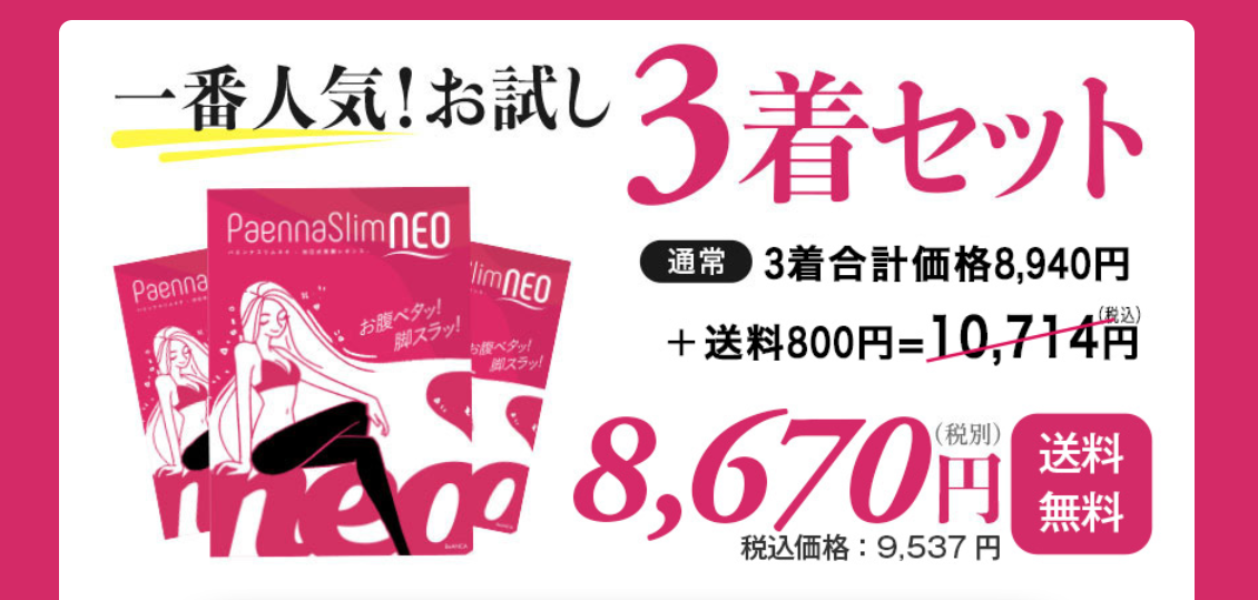 この「パエンナスリム 限定アウトレット特設販売サイト」では、パエンナスリムが1着2,780円です。通常価格は、4,980円+送料1,000円がかかれるので、半額以下ですね。これでも十分安いです!